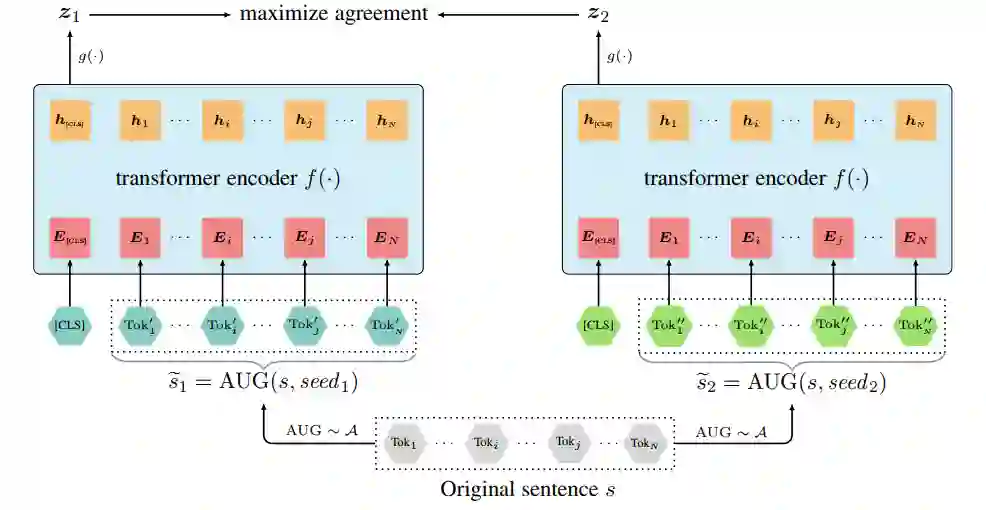 这个模型图和 SimCLR 非常的相似,作者也是借鉴了 SimCLR 的思路设计了这个结构,首先输入句子经过数据增强之后,分别送给一个 Transformer encoder,然后得到的输出经过一个映射函数 g 映射到同一个表示空间,最后就是一个对比学习的损失约束整个模型进行训练。具体细节可以参见 SimCLR 这篇文章。