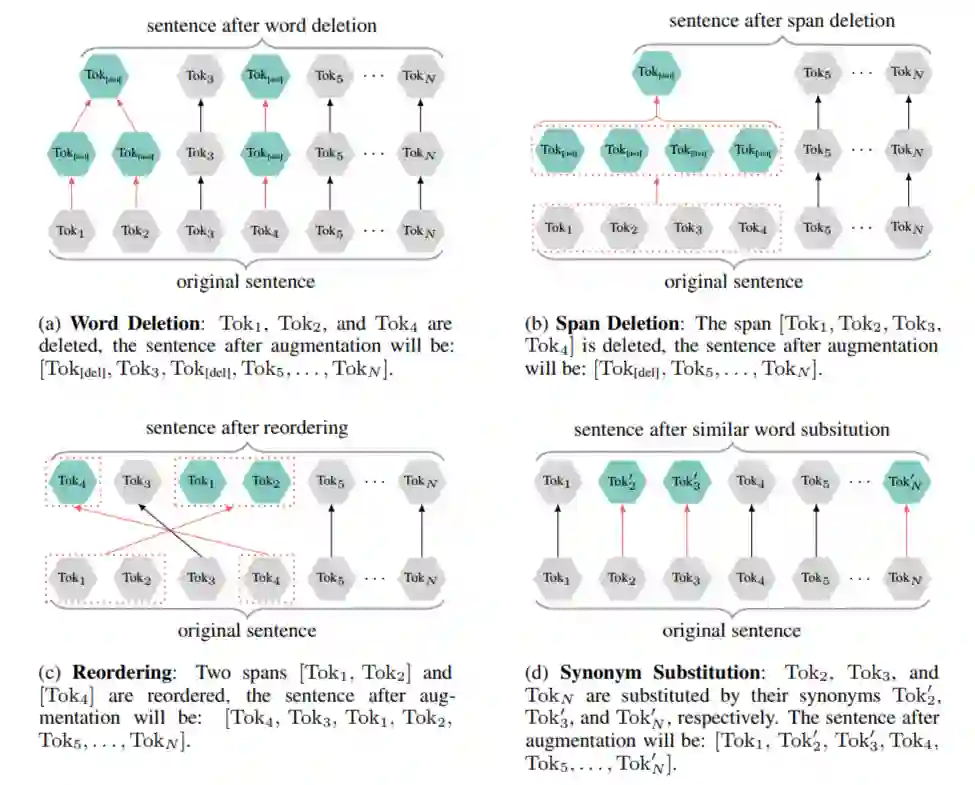 那么这篇文章的重点就在如何对输入句子进行数据增强,首先,本文使用了四种数据增强的方式,如下图:
