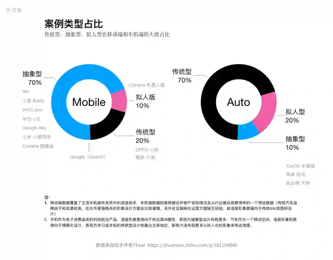 通过下图我们可以看到传统型、抽象型、拟人型语音视觉形象在移动端和车极端的大致占比。