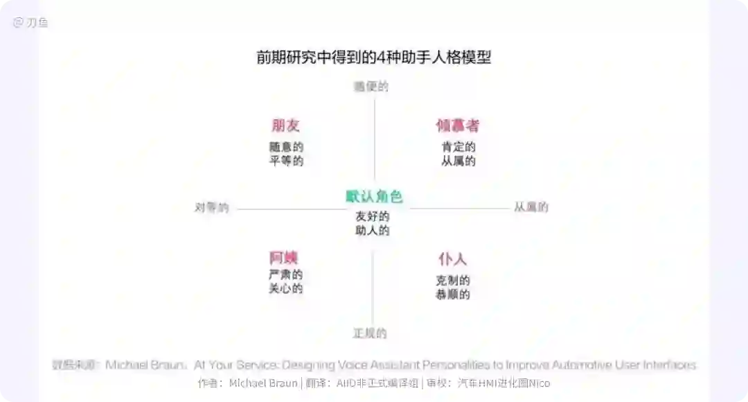 前期研究阶段:Michael Braun设计了8种语音助手人格,包含“主导 / 顺从”和“敌对 / 友好”几个人际交流间的基本维度,并在 6 个驾驶场景(3 个与驾驶相关,3 个与娱乐相关)下,邀请 19 名非 HCI 专业人员分别与 8 名助手进行对话,了解他们对语音助手人格特征的需求偏好。