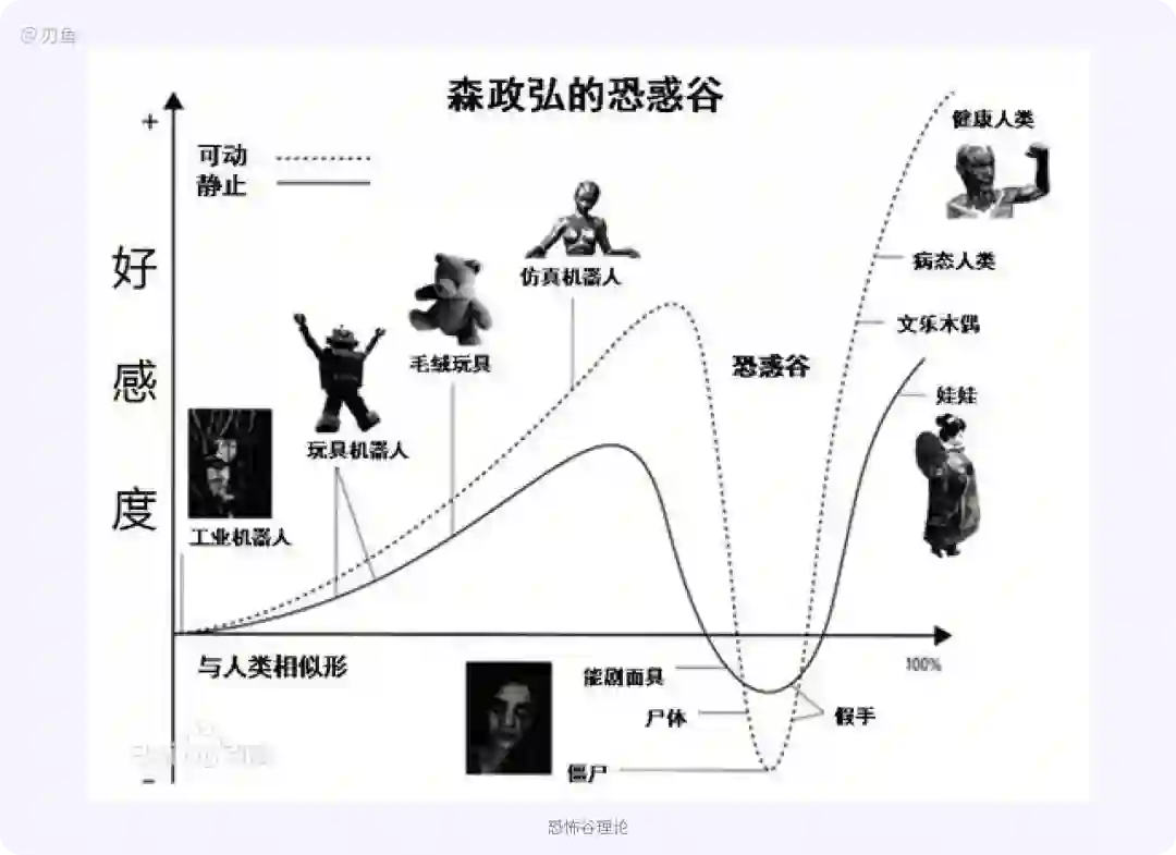 恐怖谷理论由日本机器人专家森昌弘在1970年提出。恐怖谷理论的解释为:当我们看到一个和人类极为相似但不完全相像的事物时,我们会由衷地感到恐惧。例如上图中位于谷底的僵尸,虽然同为人类外形,但本质大有区别,于是引发我们的恐惧。