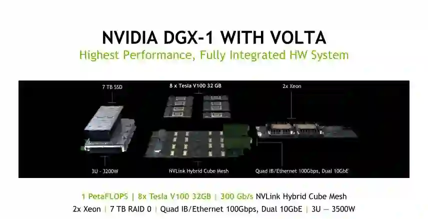 首先从硬件开始,平台底层需要做计算,我们使用了世界上第一台GPU超级计算机DGX-1,里面配置了八块32G Tesla V100 GPU以及NVLink Mesh。整个系统具有1 PetaFLOPS的计算性能,在做深度学习训练的同时,提供300 Gb/s的NVLink通信带宽。从而保证在训练时能够最快的取得效果。当然这只是硬件方面,除了硬件之外,NVIDIA也提供了一整套的软件支持。