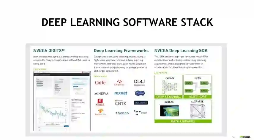 当然除了DGX和NGC之外,还要考虑怎么使用GPU为深度学习加速?这里NVIDIA提供了DIGITS、深度学习框架以及深度学习的SDK。