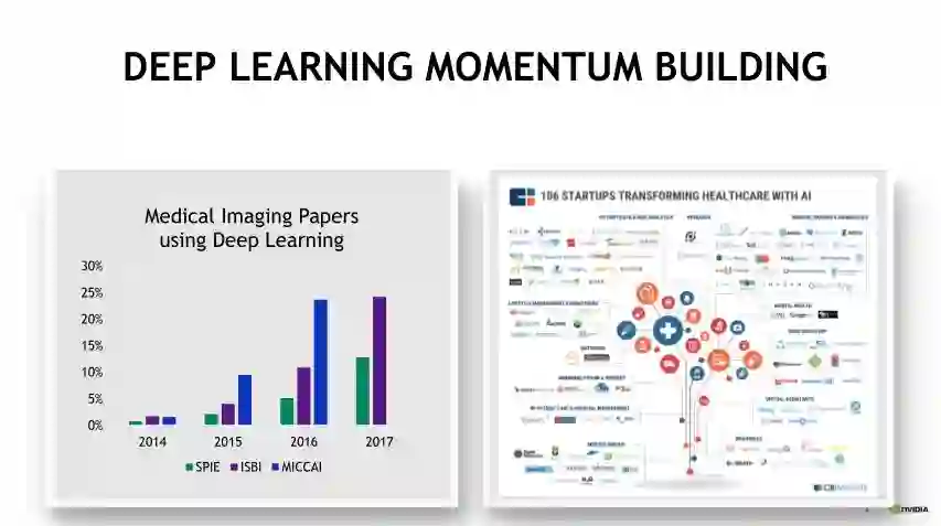 这两次成功,一次是基于心脏MI成像自动注射量的计算,可以用来衡量心脏的运行状态。另一次是关于CT扫描中肺癌的早期检测。这些都是DL在医学影像领域取得的成功。不仅如此,最让我兴奋的是在去年NVIDIA首次参加北美放射学会,吸引了大概五万名的与会者,大部分都是放射科医师,其中有四十八个初创公司都在用深度学习或者机器学习进行医学成像。而且其中百分之九十的公司都在使用GPU。在本次会议上,DL相关文章的数量,相比往年增加了十倍,NVIDIA在会议期间进行了为期5天的DLI(NVIDIA深度学习学院)培训,平均每天培训200人。
