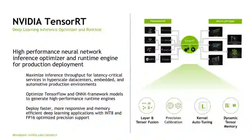 最后一个我想讲的是TensorRT,训练好一个模型,最重要的是模型的准确性和怎么把模型交付给客户使用?推理和训练其实是不一样的,训练时可能用的是FP32的精度,但在推理的时候,可以用更低的精度。训练时,各层之间的关系是固定的,而且需要把中间参数保存下来,从而进行反向迭代。但推理时,只有正向的迭代,此时可以通过使用TensorRT达到免费加速的效果。TensorRT可以做一些Layer fusion,同时也可以做些精度校准,对于不同的GPU卡,可以实现模型的自动调整,动态分配内存,不管是在内存、计算、网络结构以及参数精度方面,都可以用TensorRT达到更好的效果,取得一更好的性能。以P4为例,如果使用FP32精度的参数算力可以达到5.5T,如果使用Int 8精度的参数算力可以达到22T,所以说硬件的性能提升也需要通过软件的优化才能够完成。