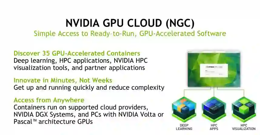 在DGX之上,我们有NGC(NVIDIA GPU Cloud),可以提供各种各样容器镜像,DGX也接入到了NGC,这样用户不需要再去配置硬件环境,通过NGC把容器镜像拉下来,就可以开展深度学习的训练和Inference(推理)。
