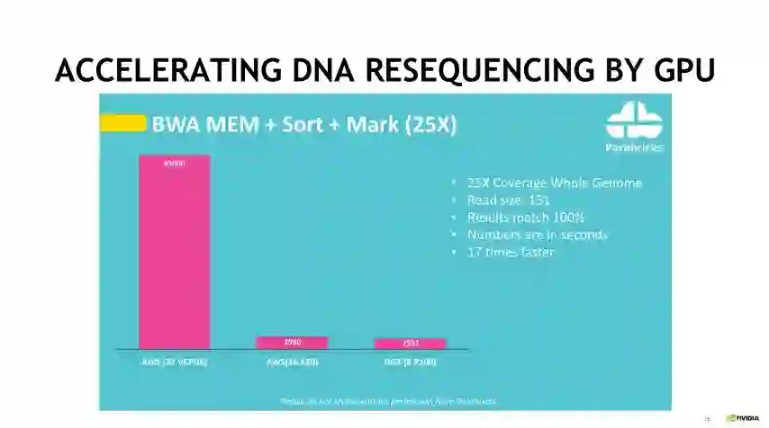 加速完基因测试之后,把每一个read的结果拼到一起,中间会有一个比对过程,把每一个小的单元都跟其对应的序列作比对,从而判断是否准确,此时就有了新的Parabricks,他们在做加速DNA测序的工作,比如说用BWA MEM (比对的工具库),支持较长的Read,然后做一些剪切性的比对。通过这样的方式,用GPU来加速,可以看到跟32个CPU相比,其性能达到了25倍的提升,结果的准确率达到100%。