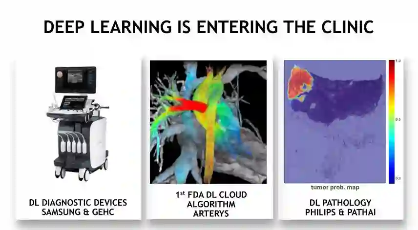 第二个领域是深度学习在诊所里的应用,三星和通用的扫描仪已经在使用深度学习来优化整个工作流,提高准确性。比如婴儿三维超声波检测时,可以冻结一些图像进行测量。第二个ARTERYS公司,也是首批通过FDA认证的公司。通过与GE合作,把他们的工具带到了心脏病专家那边,进行所有相关的一些检测,能够进一步提高护理质量。最后一个是PATHAI与飞利浦合作,也是第一个由FDA批准的扫描仪诊断,通过将病理图片与热力图结合,帮助病理学家分析肿瘤的情况,进一步降低病理学家诊断错误率,大约降低50%,使得病理学家在看图的时候能够更加方便。