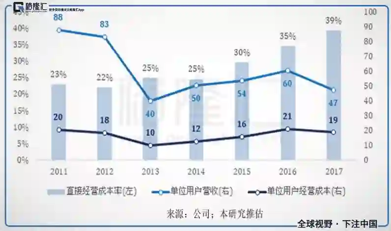 图二一、直接经营成本率并没有随用户数增加而产生规模经济;直接经营成本率(左轴),百分比;单位用户营收/成本(右轴),美元;