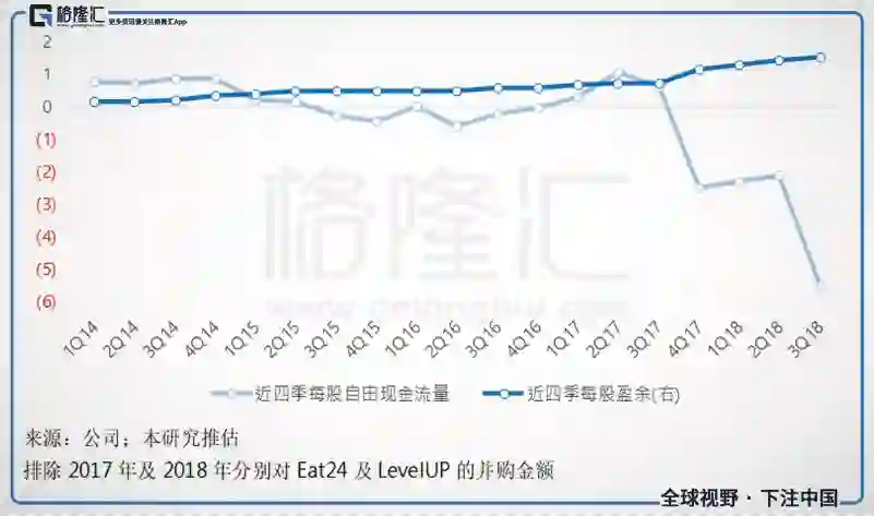 GRUB获利非常好看之外,若排除2017年及2018年分别对Eat24及LevelUP的大额并购,其自由现金流量也基本上与公司获利同步成长,体现了公司高速成长的同时,也兼顾获利成长。