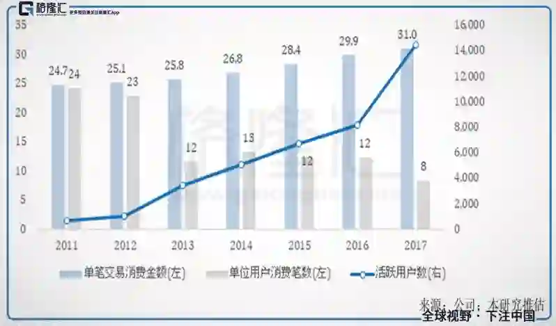 图十八、GRUB营收变动因子;单笔交易消费金额(左轴),美元;单位用户消费笔数(左轴),次数/年;活跃用户数(右轴),数量(年);