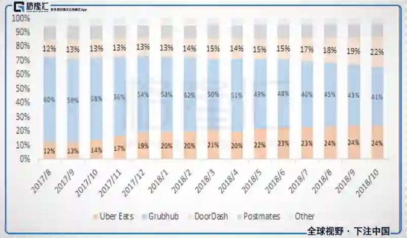 若只看专注第三方外卖的平台公司,可以从图八看出,美国外送市场之中,主要由GRUB、UberEats以及Doordash霸占,然而GRUB市占率在近一年的时间内缩减得特别快。
