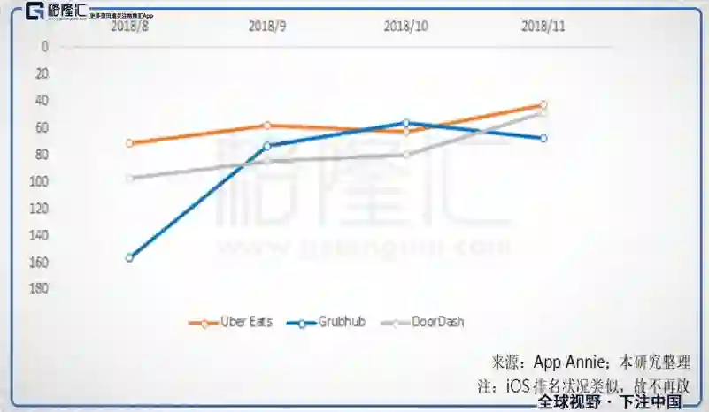 图十六、Uber Eats APP下载量也超过GRUB;APP下载排名-Android,名次(1为最多下载次数之APP);