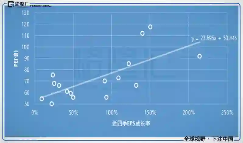 图二五、GRUB过去每股盈余年增率与PE倍数高度相关;近四季每股盈余年增率(X轴),百分比;PE,倍;