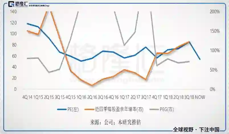 但是,我们永远要反过来思考自2017年第四季以来,GRUB的PEG都稳定维持在60%-70%左右的比值,也就是近四季每股盈余年增率只要增加1个百分点,公司的PE就会增加0.6-0.7倍。