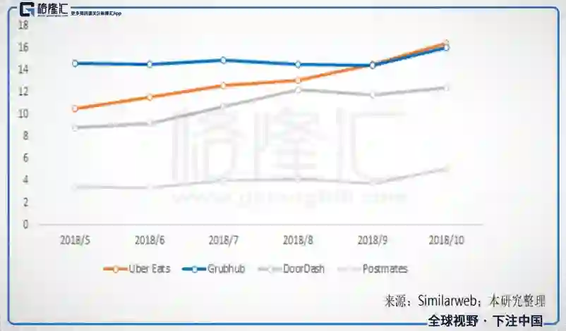 图十五、Uber Eats网站流量近期超越GRUB;网站流量,百万次;