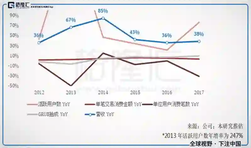 其中最明显的即为单位用户消费金额快速下滑,在2012年以前GRUB既有消费者的消费次数较频繁,平均每年可以消费到23次,然而2013年开启并购策略,并购Seamless之后,单位用户消费笔数大幅减少,掉到每年12次,显示Seamless平台用户的用户黏浊度很低,不常使用该APP,然而这样的劣势被其庞大的活跃用户所抵销,当年度GRUB活跃用户数年增率高达247%,使得营收年增率仍达67%。