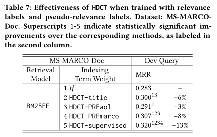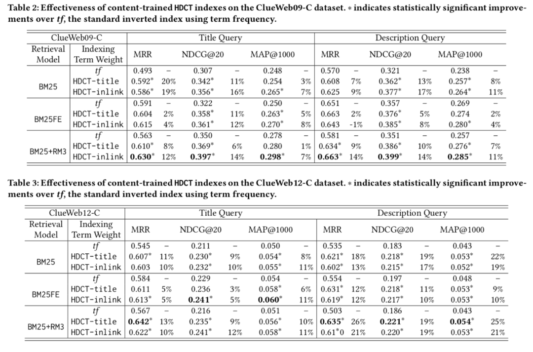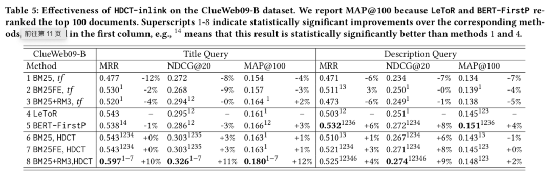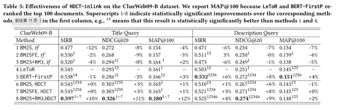 实验本文实验在 ClueWeb 数据集(包括 ClueWeb09-B/C,ClueWeb12-C)和 MS-MARCO Document Ranking 数据集上实现。作者在前者验证了基于内容的训练方法在初步检索任务和重排序任务上的效果,在后者研究了不同训练方法之间的效果差异。 ClueWeb数据集 作者首先在该数据集上对比了传统的 term frequence 算法和 HDCT 得到的权重对 BM25 及相关算法的效果差异。作者分别使用文本的 title 和 inlink 训练模型,发现两种情况效果均优于传统的 term frequence,而在不同的任务上两者效果各有千秋,总体而言使用 inlink 效果略好。