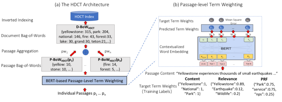具体来说,权重的选取有两种方式:第一种方式认为各段落的重要性相同,即 ;第二种方式考虑用户阅读的注意力随文本的深入而下降,认为各段落的权重随位置前后逐步递减,具体可设置为 。该步骤得到的文档级词项权重可直接应用 BM25 等初步检索模型。模型训练根据给定的 ground truth 权重分数 ,作者以最小化平均平方误差作为目标训练模型,损失函数如下: