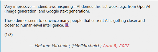 圣达菲研究所(the Santa Fe Institute)复杂性研究教授、《人工智能:人类思考的指南》(Artificial Intelligence: A Guide For Thinking Humans)一书的作者梅拉妮·米歇尔(Melanie Mitchell)在Twitter上列出了一些重要问题。