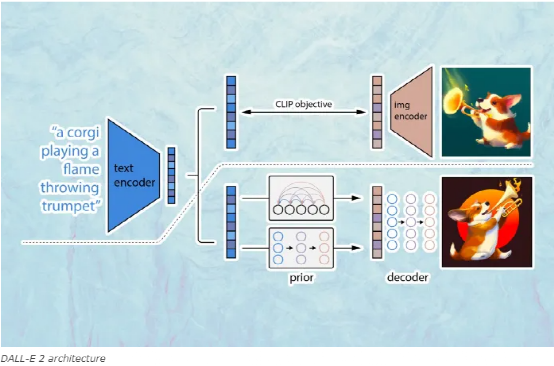 DALL-E首先在图像和标题上训练CLIP模型,然后使用CLIP模型训练扩散模型。基本上,扩散模型使用CLIP模型为文本提示及其相应的图像生成嵌入,随后再尝试生成与文本对应的图像。