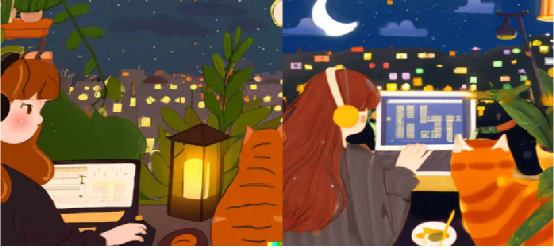 以下示例(也来自OpenAI的网站)展示了DALL-E 2的另一个特性,即生成输入图像的变体。这里,你不是向DALL-E 2提供带有文本描述,而是提供图像,它会尝试生成相同图像的其他形式。而且,DALL-E可以做到保持图片中各个元素之间的关系,包括女孩,笔记本电脑,耳机,猫,背景中的城市灯光以及挂有月亮和云彩的夜空。