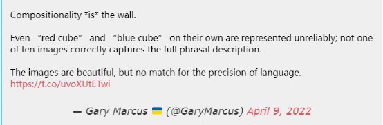 DALL-E 2论文提到了该模型在生成文本和复杂场景方面的一些局限性。在回应推文时,Marcus曾指出,DALL-E 2论文实际上证明了他在论文和论文中提出的一些观点。