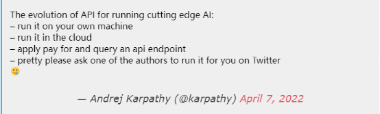 下图便是特斯拉AI总监Andrej Karpathy 的调侃:AI API的调用已经从可以在你的电脑运行变成了你需要在推特上让作者帮你运行。