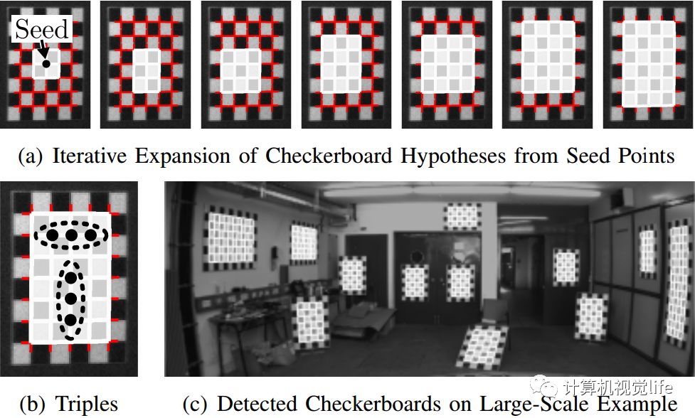 给定一个种子角点,我们沿着其边缘方向搜索产生一个初始化的种子棋盘格。该棋盘格有3x3个角点,有2x2个棋盘(见上图(a)中最左侧)。然后以此种子棋盘格为基础,分别从最外沿的4个边缘去生长棋盘格,生成4个新的棋盘格proposals。如果其中能量最小的那个棋盘格的能量值比棋盘格扩展前的能量更减少了,就说明生长成功,用这个新的棋盘格代替原来棋盘格。继续生长,直到4个 方向新棋盘格能量不再减少为止。上图(c)是最终的检测结果。