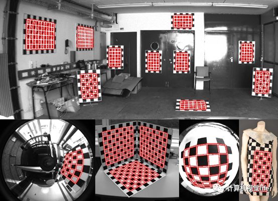 值得注意的是,由于结构能量约束中使用的是局域的线性约束,上述棋盘格生长方法可以扩展到鱼眼镜头拍摄的高畸变图像。