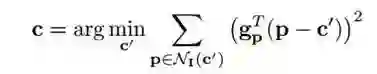 上图是理想情况下棋盘格,但是实际上边缘不可能这样锐利(只有一个像素大小),梯度方向也没有这么理想,最理想的角点c的位置就是我们在角点候选点c’的邻域Ni(c’)内找到满足以下式子的c’:
