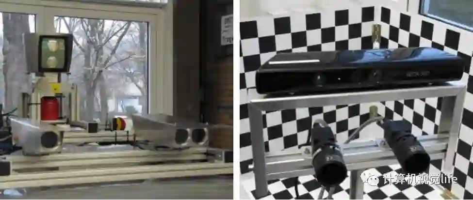 这里介绍一种可以实现全自动化对相机-相机、相机-距离传感器之间进行标定的方法,并且有论文和源码哦(见文末)!例如,该算法可以实现同时对三目相机 + 激光扫描仪(下图左)、双目相机 + Kinect (下图右)的标定。是不是觉得很赞!