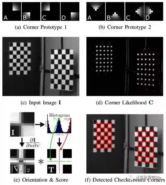 本文棋盘格角点检测算法主要分三个步骤:定位棋盘格角点位置;亚像素级角点和方向的精细化;优化能量函数、生长棋盘格。下面分别详细介绍。