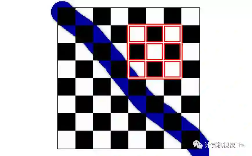 要处理的图片中一般会包含很多非棋盘的自然或人工背景,所以第一步就是定位角点的位置。下图是角点检测原理示例。