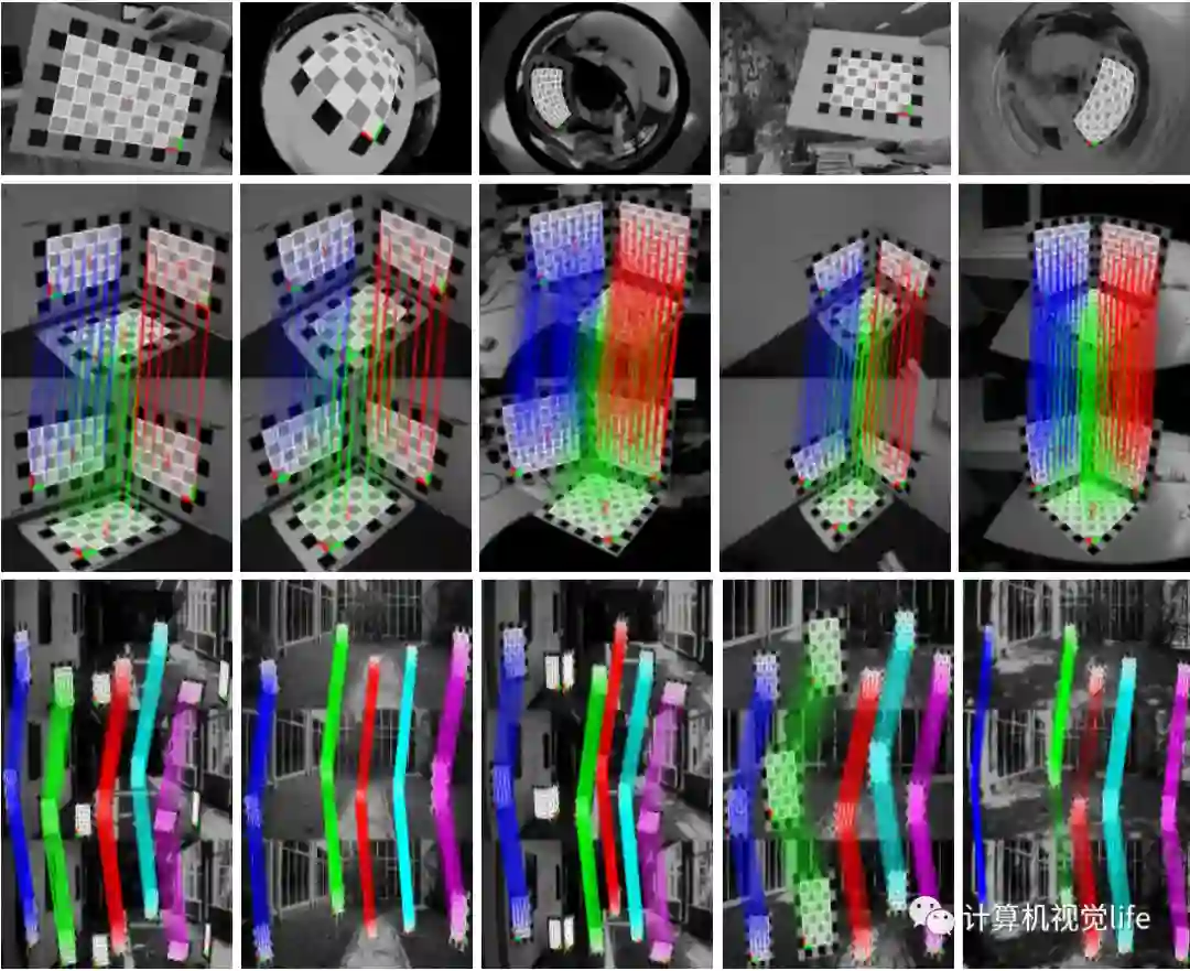 结构恢复和棋盘匹配结果如下图所示。最上面的一行是单目广角和鱼眼相机标定图像;中间一行是双目相机和Kinect相机标定图;最下面一行是三目相机和Velodyne HDL 64线激光扫描仪标定图。