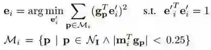 下一步就是refine边缘方向矢量e1,e2,可以通过最小化normals的偏差和对应的梯度实现: