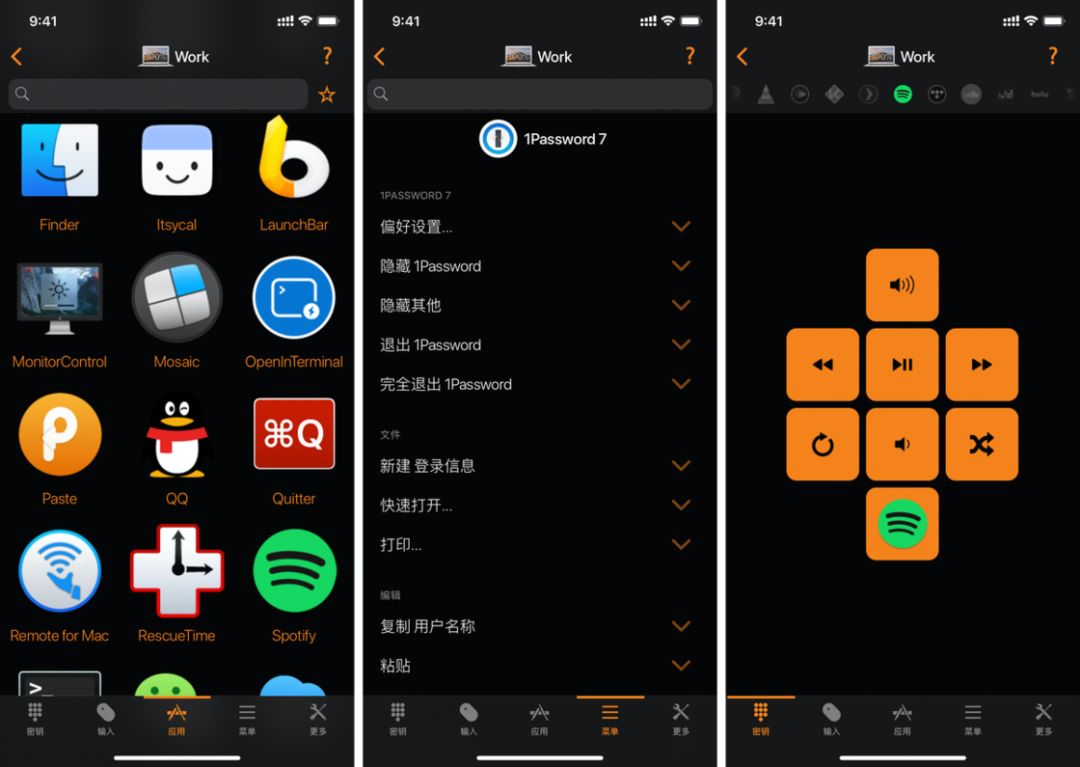 使用前,你需要分别安装其提供的  iOS  和  macOS  客户端。完成 Mac 上的一系列授权之后,就可以通过局域网与 iOS 应用进行配对。Mac 遥控器支持对电脑的基本控制,例如:关机、睡眠,启动屏幕保护等。此外,你还可以控制 Mac 上安装的全部应用,支持打开特定应用后并读取其菜单设置选项。Mac 遥控器还针对常见的流媒体应用,包括 Spotify,Netflix,Hulu 等进行了专门优化,方便你躺着刷剧。