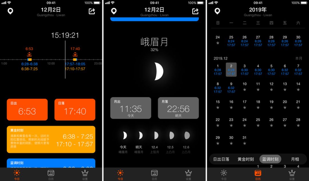「日出月落」则是摄影爱好者必备的「蓝色时刻」计算器。相比于天气类应用,「日出月落」并不只是用来查看日月起落的时间。应用会根据你所在的位置来计算当天的日出日落时间,并且为你计算当日的黄金时刻与蓝色时刻。除此之外,如果你想拍摄月亮,也可以用它来查看当日的月相和起落时间。
