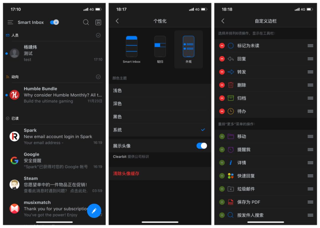 上周,邮件应用 Spark 更新 2.5 版本,带来了深色模式的同时,还更新了应用的整体设计。在「外观」设置项中,应用还增加了邮件头像的展示功能,开启后发件人左侧会显示头像,方便你更快速地进行辨认。Spark 使用的头像素材由  Clearbit  提供,如果你的邮件以个人或公司邮件为主,Spark 则默认读取系统通讯录中邮箱对应用户的头像。