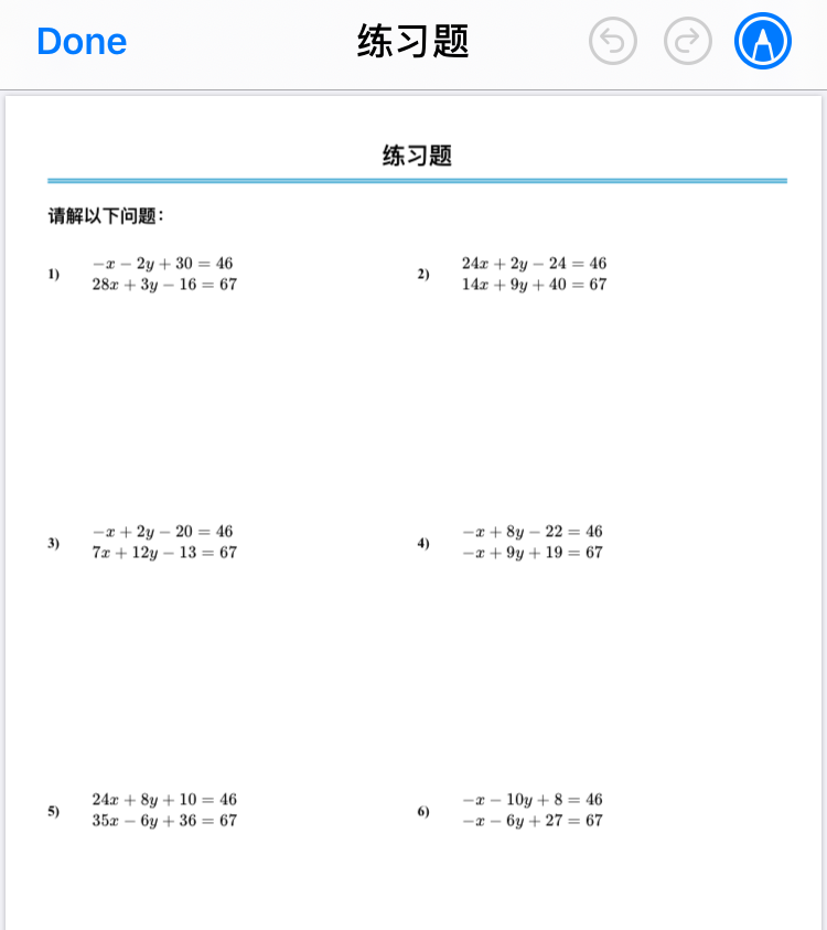 除此之外,微软数学还会在你每次查询题目后为你提供一些同类的练习题。应用会为你自动生成一个 PDF 文件,你可以打印出来,或者直接在 iPad 上用 Apple Pencil 作答。这些题目可以帮助学生反复练习,熟能生巧。不过习题并没有附答案,如果你想要获取详细步骤,还得用微软数学再次识别,稍嫌麻烦。