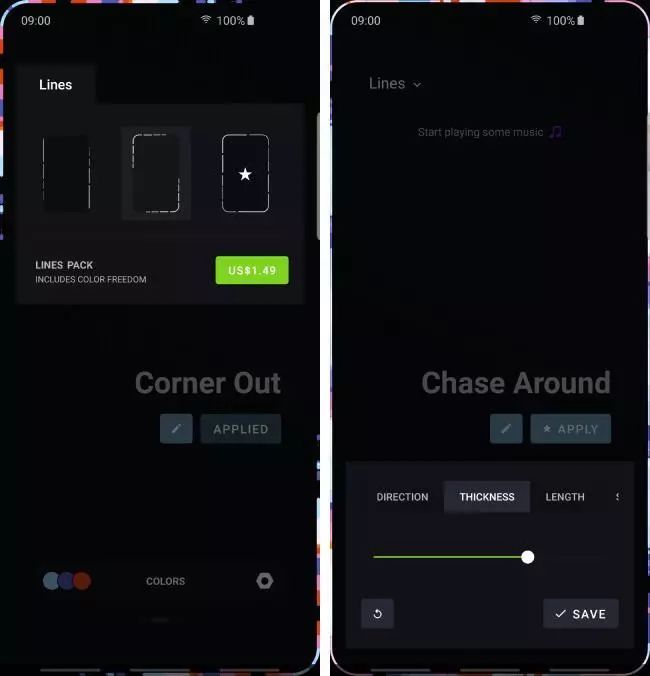 理论上来讲,Muviz Edge 支持所有带屏幕的 Android 设备,在允许 Muviz Edge 获取相关权限后,它可以监控手机音频输出来显示音频可视化。如果允许 Muviz Edge 获取通知信息,你也可以在设置内控制与哪些 App 协同工作。Muviz Edge 内置三种样式,均可以自定义宽度、速度和颜色等选项,内购解锁后还可以根据播放音乐的专辑封面自动拾取颜色(同样需要允许通知信息权限)。值得一提的是,对于圆角屏幕,Muviz Edge 还支持自定义圆角弧度,这样就不必担心可视化图形被边框「半路截断」了。