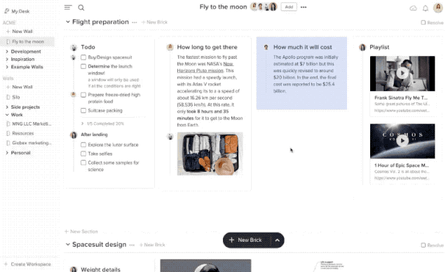 Walling 是一款可以被用于梳理大纲、记录灵感,以及整理头脑风暴的在线协作工具。你可以把 Walling 看作是完全展开的看板工具,其基本单元是 Brick 块,对应着看板工具中的每一个项目。如下图所示,针对于每一个 Brick 块,均可添加文字、附件以及嵌入其他多媒体。同时,你可以对每个 Brick 块进行任意排列组合,让其形成前后逻辑关系。