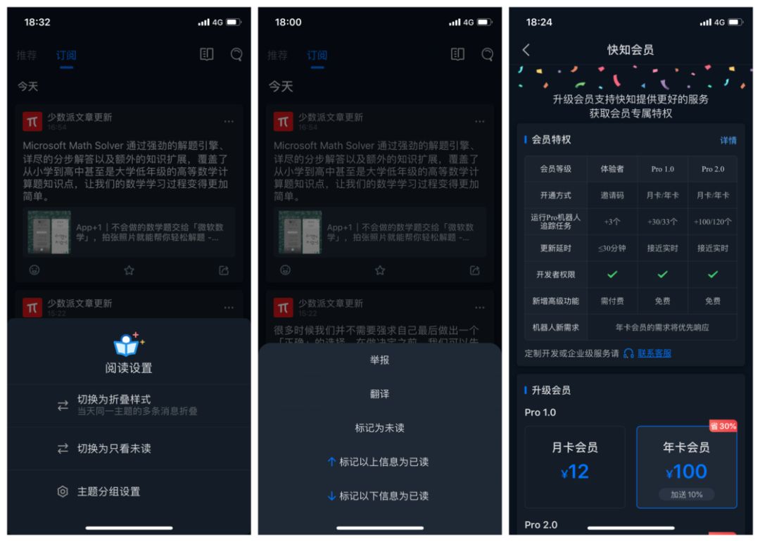 快知设置了两档会员等级,Pro 1.0 每月 12 元,2.0 每月 30元,两档差异主要在机器人可用数量和任务追踪数上。需要注意的是,非 Pro 用户在消息更新上可能会有小于 30 分钟的延迟,具体的收费规则和特权可以在应用中查看。