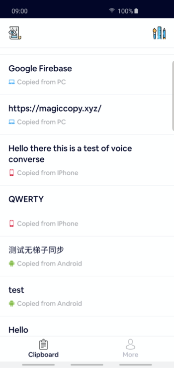 Magic Copy 支持 Android、iOS、Windows 和 MacOS,功能相对简单,仅支持文字类型内容,移动端采用卡通风格的 UI 设计非常讨喜,移动客户端同时支持手动输入内容和语音转换文字(仅支持英文);桌面端窗口虽然并谈不上好看,但可以置顶显示以方便用户批量粘贴复制。