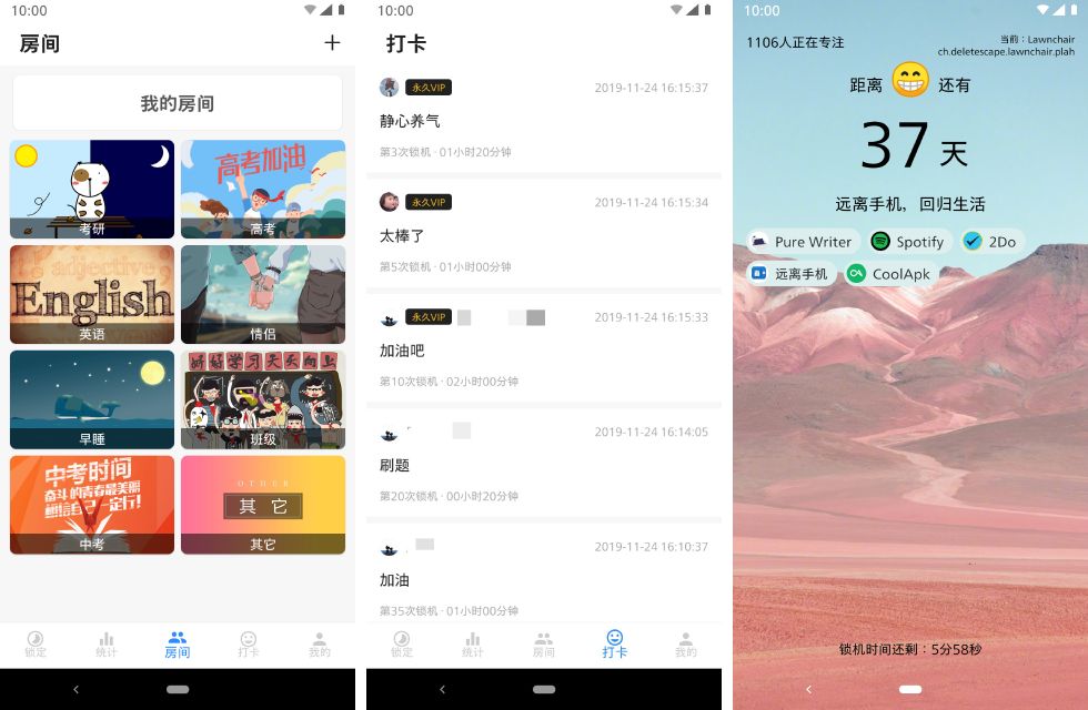 此外,远离手机引入了房间、打卡等社交属性,房间适用于伙伴结对学习,打卡排名则能为用户带来成就感,是一种不错的激励手段。在锁机界面,远离手机会呈现当前同时在线进行锁机的具体人数,这在一定程度上也能鼓励用户坚持下去。