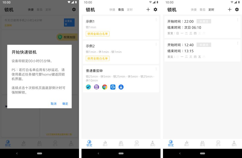 远离手机将锁机方式分为「快捷锁机」、「番茄锁机」和「定时锁机」三种。通过快捷锁机我们可以随时随地开启一段锁机之旅,自由度最高;番茄锁机模式,顾名思义,即将番茄工作法与锁机相结合,自由设定番茄时长和休息时长,劳逸结合,从而将效率最大化。当面临重要考试或任务需要保证投入时间与效率时,不妨开启番茄锁机模式;定时锁机则更为强效,用户提前设定好一个时间段后,到时直接强行锁机,适用于想要改变熬夜习惯的夜猫子。