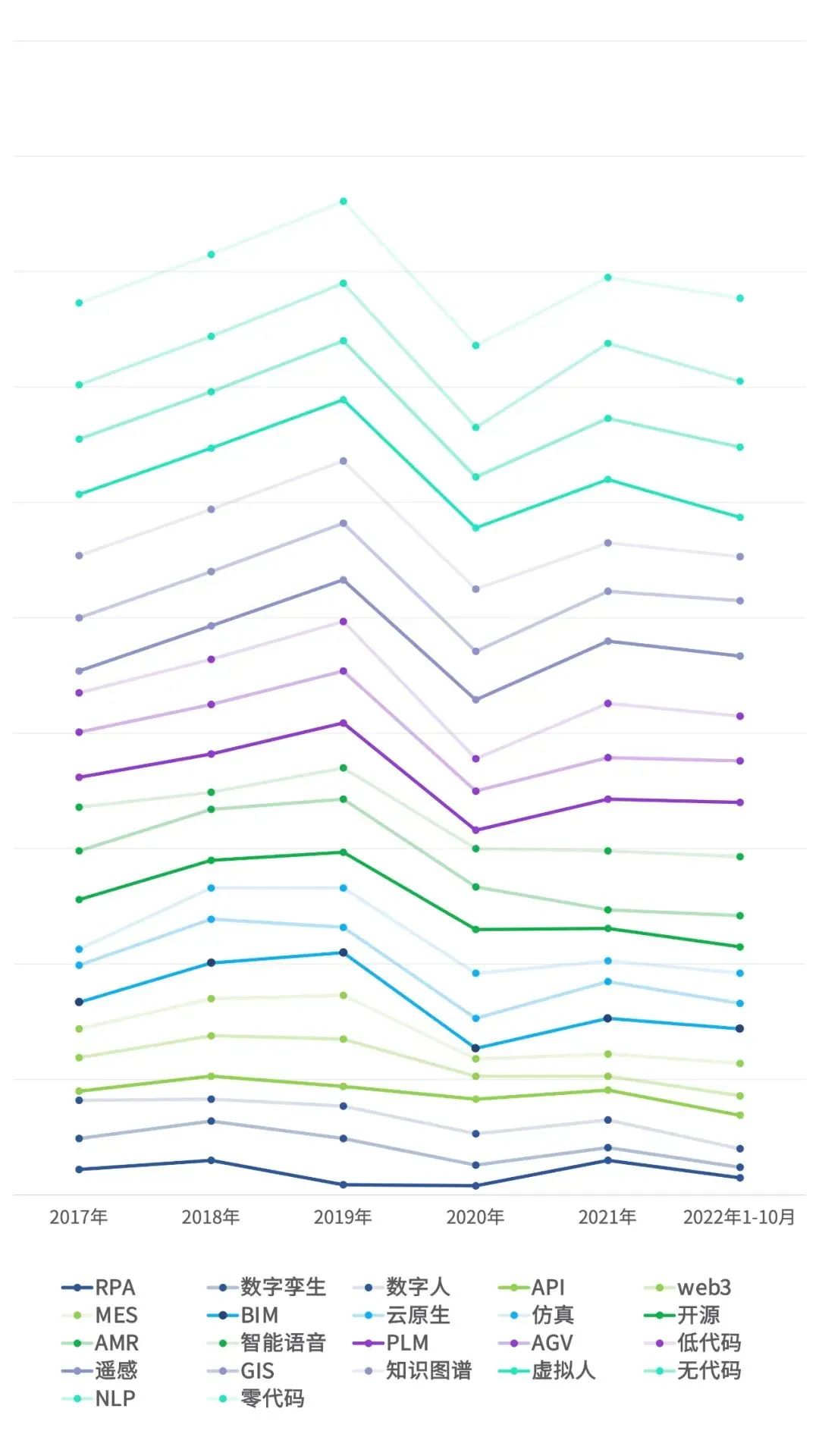 2017年之后,大公司在数字化实践的选择上往往倾向于主流的技术,词频排名最靠前的10个词从2017年开始基本十分稳定,很少发生变化;