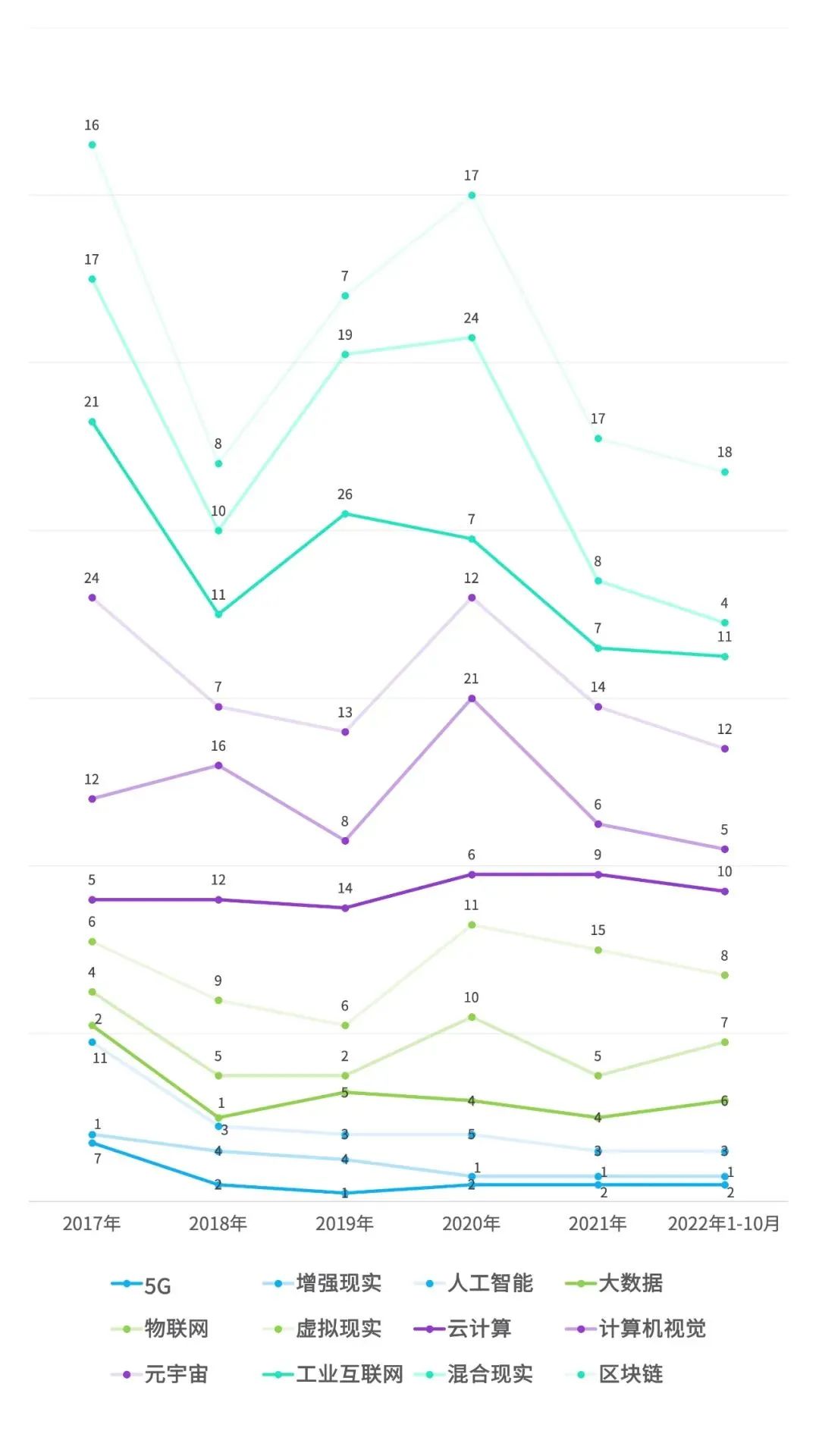 基于我们的统计,2022年1-10月这662家知名公司的2万多篇数字化相关报道中,涉及到最多的前10项细分技术包括:增强现实、5G、人工智能、拓展现实、计算机视觉、大数据、物联网、虚拟现实、数字孪生、云计算。
