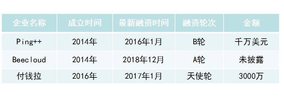 据雷锋网统计,国内专注线上聚合支付的企业有Ping++、Beecloud、付钱拉等,多数均支持多平台、多场景,将收款、付款、委托代扣、分期等多种支付需求都纳入其中。