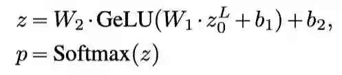 其中,是第一层的权重和偏差,是第二层的权重和偏差,p是输出类的预测概率分布。注意,在大多数任务中,是class token在Transformer的最后一层的嵌入,除了masked language modelling,在masked language modelling中,它是masked token在最后一层的嵌入。